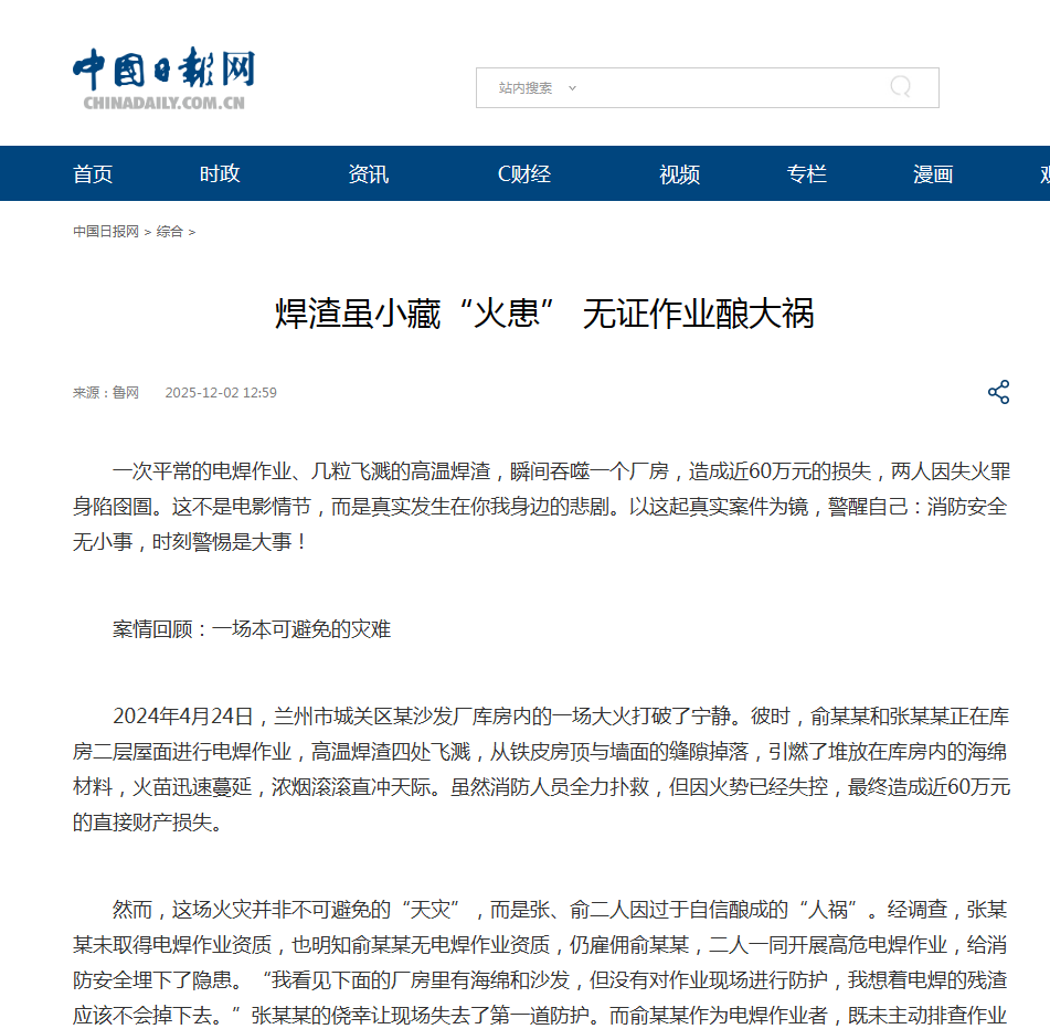 大家要以典型案例为警示,紧绷安全之弦,严守法律法规,共同筑牢消防安全“防火墙”,让焊花只为建设添彩,让火光只予生活温暖。