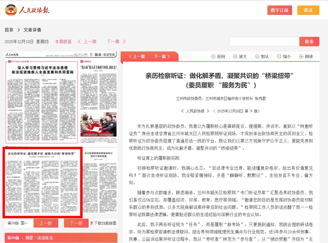 人民政协报——亲历检察听证:做化解矛盾、凝聚共识的“桥梁纽带”(委员履职 “服务为民”)